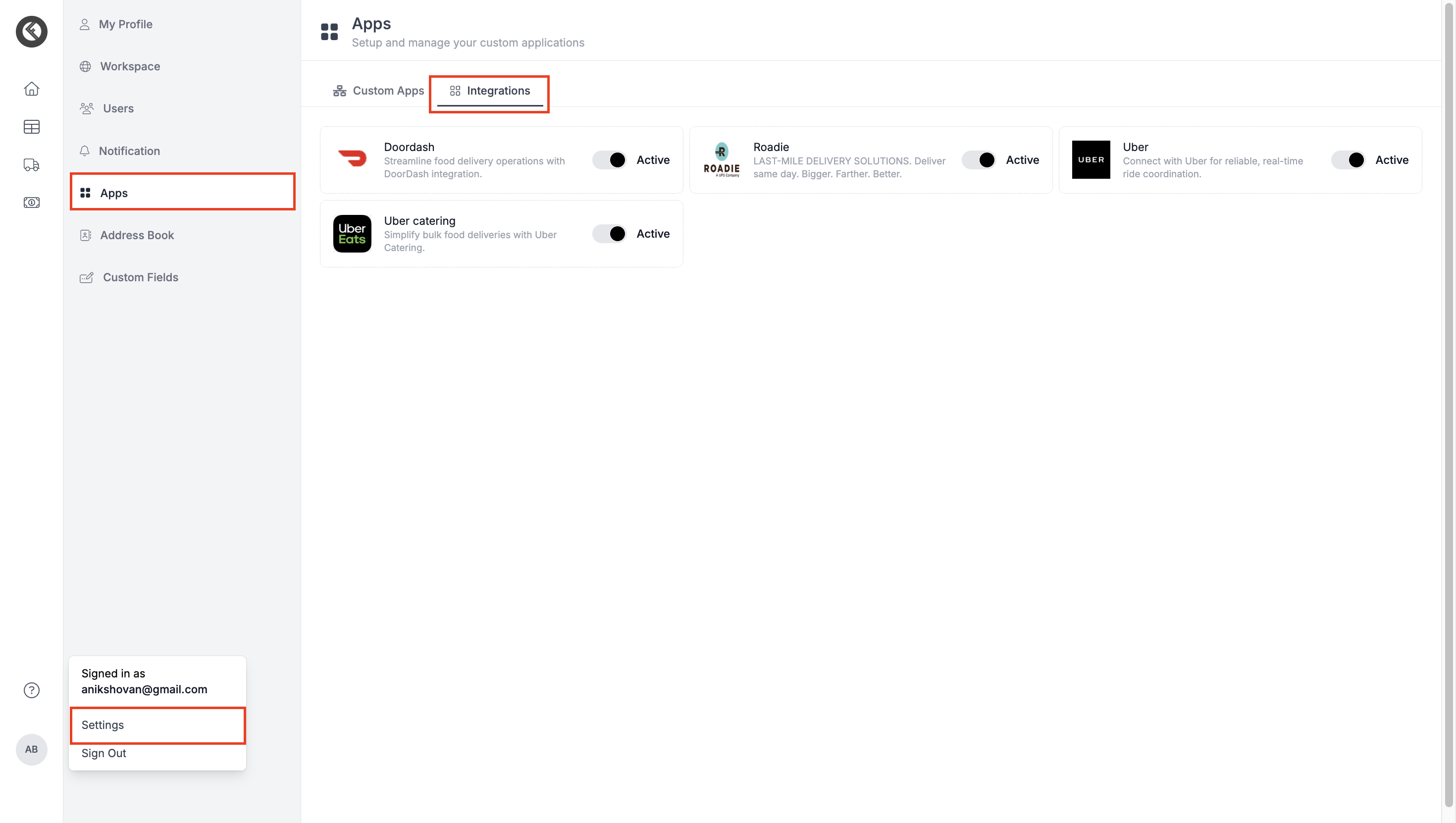 In FULFLLD, click your avatar (bottom-left). Then click Settings. Go to App Settings and open the Integrations tab.