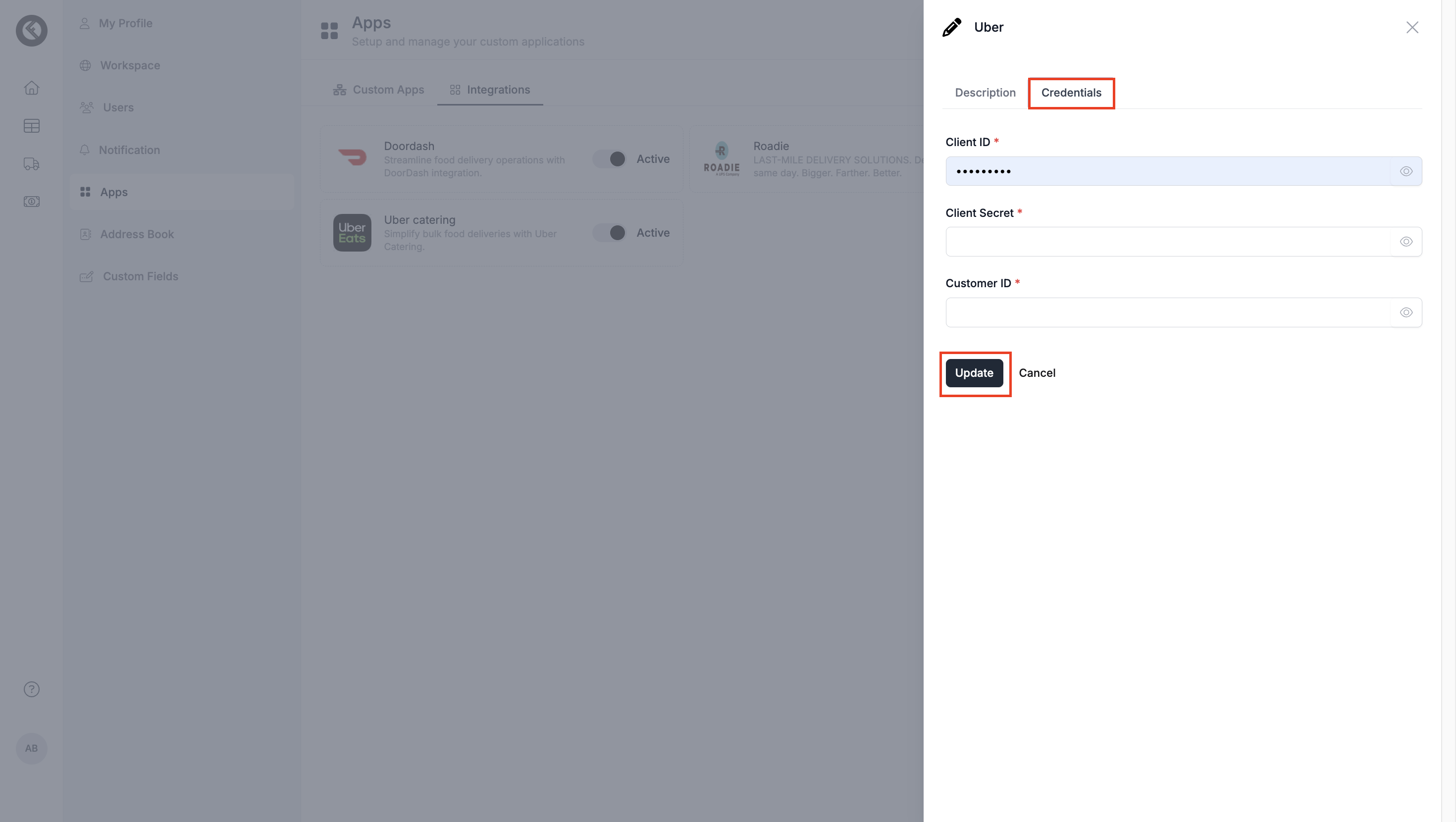 Click Uber, DoorDash, or Roadie. Then the setup panel opens on the right side. Click the Credentials tab. Then enter your Customer ID, Key, and Secret. Credentials can be different based on the different DSPs.