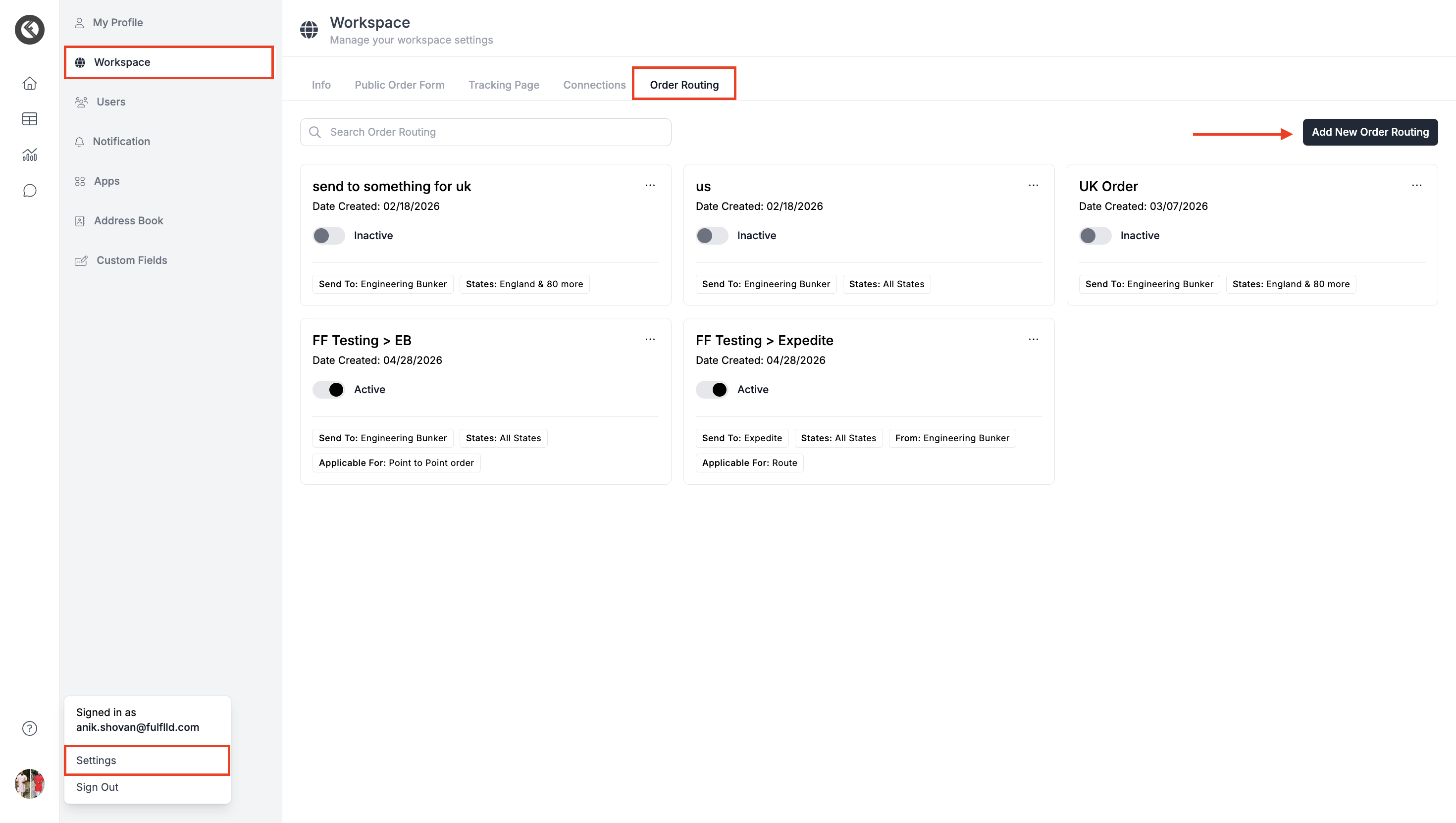 Go to Settings → Workspace → Order Routing and click "Add New Order Routing".