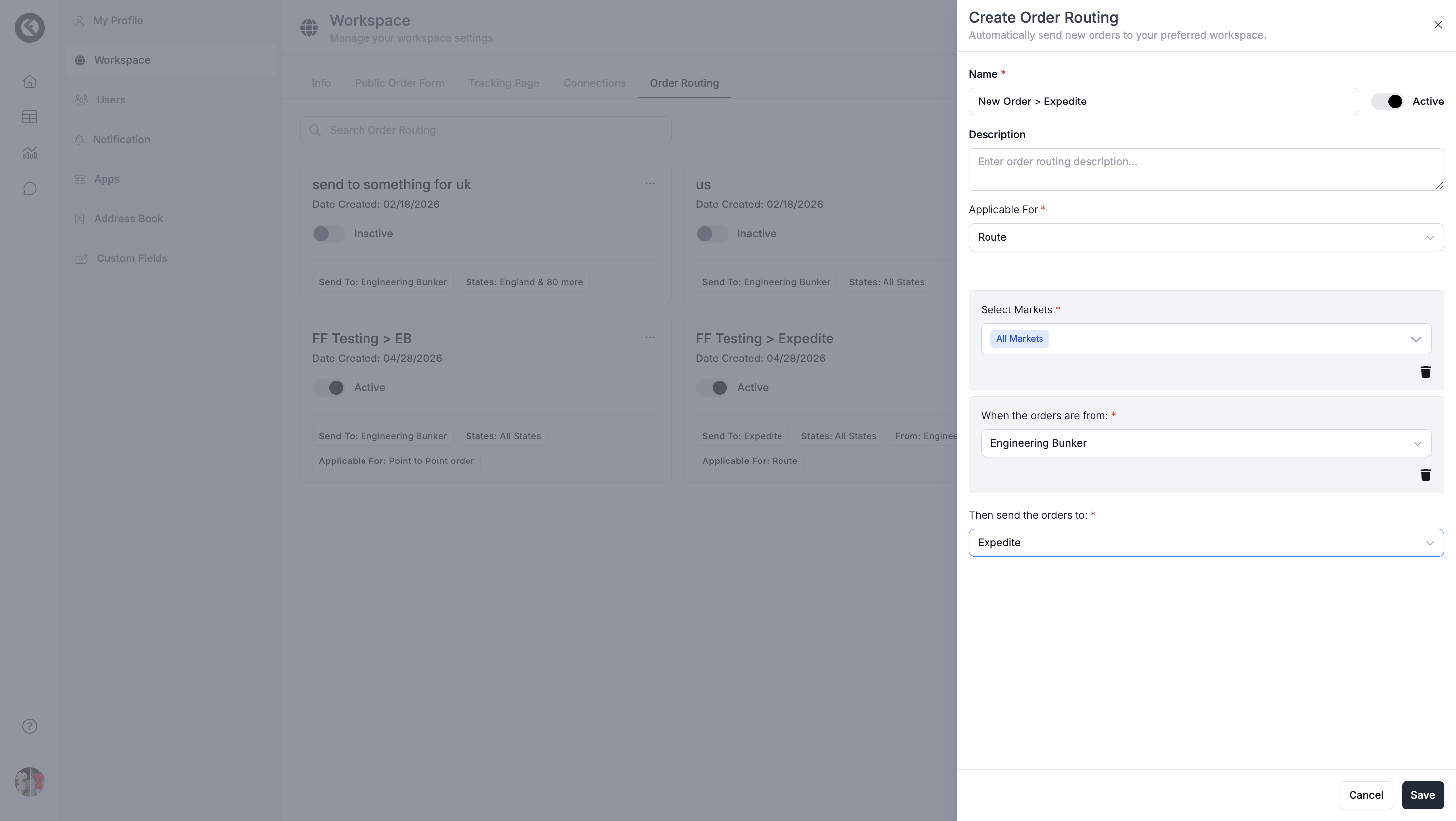 Order Routing allows you to automatically send newly created orders or routes to an internal workspace or external DSP (like Expedite, Uber, DoorDash, or Roadie) based on predefined rules.
