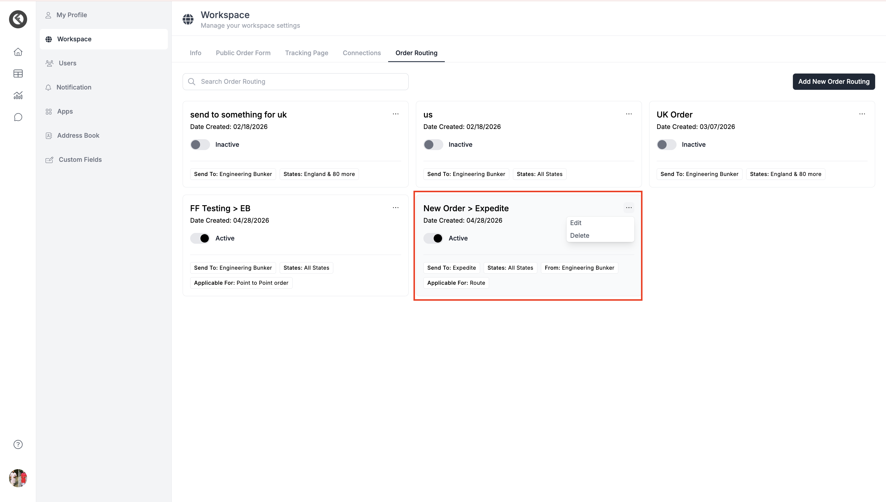Once saved, the card will appear in the order routing tab showing all the conditions set for the logic. You can edit or delete the logic later as per your requirement.